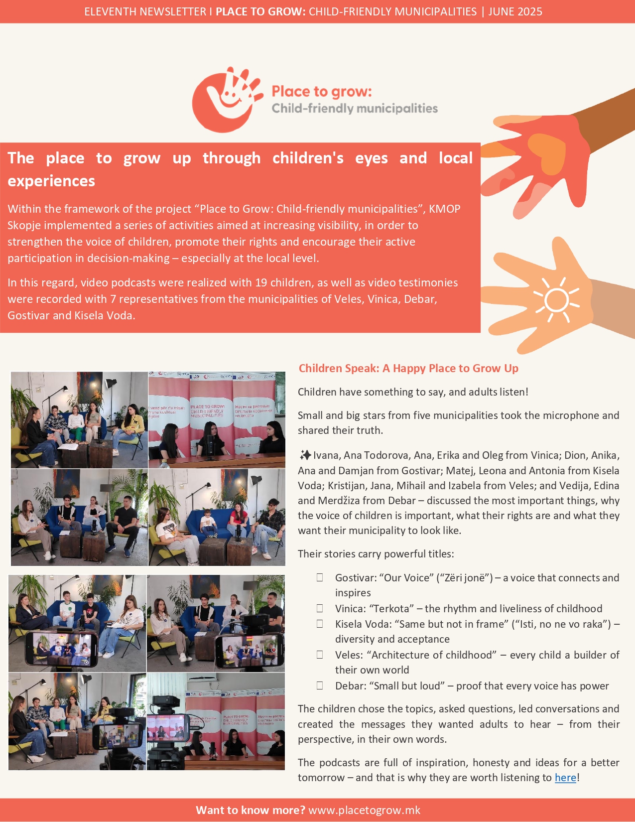 Within the framework of the project “Place to Grow: Child-friendly municipalities”, KMOP Skopje implemented a series of activities aimed at increasing visibility, in order to strengthen the voice of children, promote their rights and encourage their active participation in decision-making – especially at the local level.